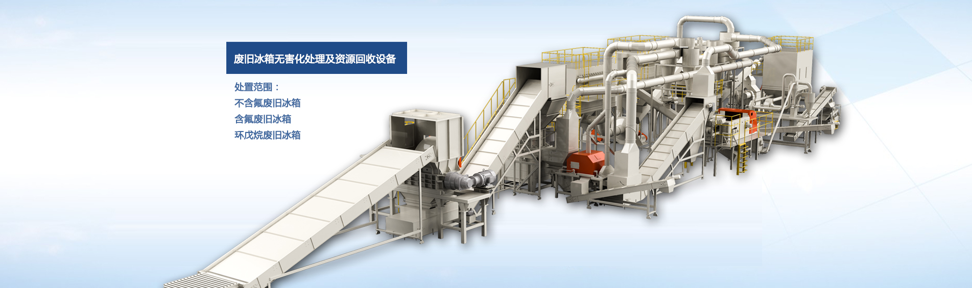 公司自主研發(fā)的廢舊冰箱無(wú)害化處理及資源回收技術(shù)及設(shè)備, 獨(dú)具 “雙軸撕碎機(jī)+立式破碎機(jī)+大風(fēng)量稀釋環(huán)戊烷氣體”的專利組合設(shè)計(jì), 主要用于對(duì)廢舊冰箱中的各種原材料進(jìn)行分離、 回收和利用, 具有自主知識(shí)產(chǎn)權(quán), 經(jīng)國(guó)家工業(yè)和信息化部科技成果鑒定為 “填補(bǔ)國(guó)內(nèi)空白, 達(dá)到國(guó)際先進(jìn)水平” 。